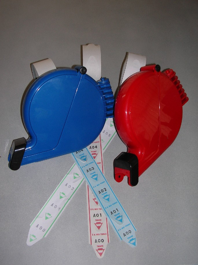 Dispencer Distributore di scontrini eliminacode. Si possono abbinare anche al colore dello scontrino per meglio evidenziare i vari reparti; disponibile nei colori Rosso, Giallo, Blu, Verde e Bianco. COme accessori per questo articolo ci sono il Cartello informativo per la clientela, il supporto per il fissaggio a muro o la piantana di sostegno.